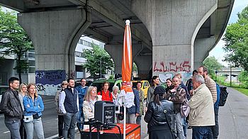 Im Dezember 2024 haben wir vor Ort am Leopold-Ungar-Platz unseren GB*Infopoint MamMUTH eröffnet. Hier informieren wir Sie über aktuelle Entwicklungen im Gebiet, geplante Veranstaltungen und laden zum spielerischen Erkunden der Muthgasse ein. Der Infopoint ist auch Startpunkt für unsere Entdecker*innen-Touren, die wir veranstalten.