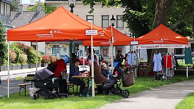 Kinder verwandelten eine gesperrte Straße in einen bunten Spielplatz und gestalteten ihre „Stadt der Zukunft". Beim beliebten Kleidertausch wechselten Lieblingsstücke ihre Besitzer*innen – ganz im Sinne der Ressourcenschonung.