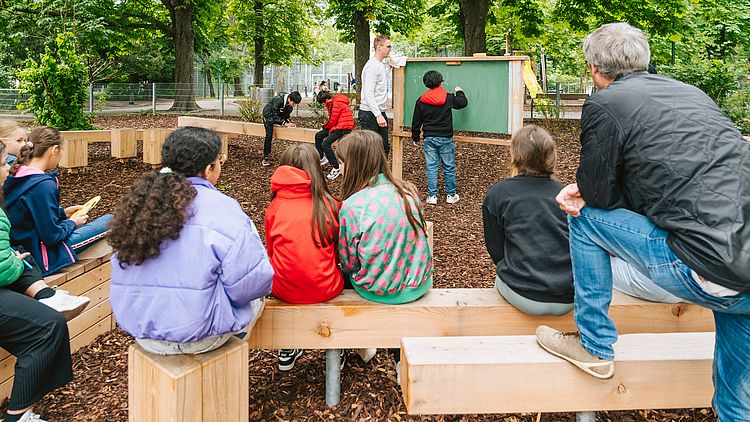 Nun ist es so weit! Lernen in der Freiluftklasse ist seit heuer für die Schülerinnen und Schüler der Volksschule Märzstraße möglich. Der neue Schulvorplatz mit der Freiluftklasse lädt zum Verweilen, Spielen und Lernen ein. Wo früher Autos parkten blühen heute bunte Staudenbeete.