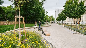 Zu den bestehenden Bäumen wurden neun neue Bäume gepflanzt, die in Zukunft Schatten spenden. Zusätzlich wurden sieben große Pflanzbeete mit blühenden Stauden errichtet. Unterschiedliche Sitzmöbel machen den Schulvorplatz zu einem Treffpunkt für die Nachbarschaft. Auch das gewünschte Wasserspiel in Form von Bodendüsen mit einem Wasserlauf sorgt für Abkühlung und lädt zum Spielen ein. Ein attraktives helles Pflaster mit Rasenfugen sorgt für ein kühleres Umfeld.