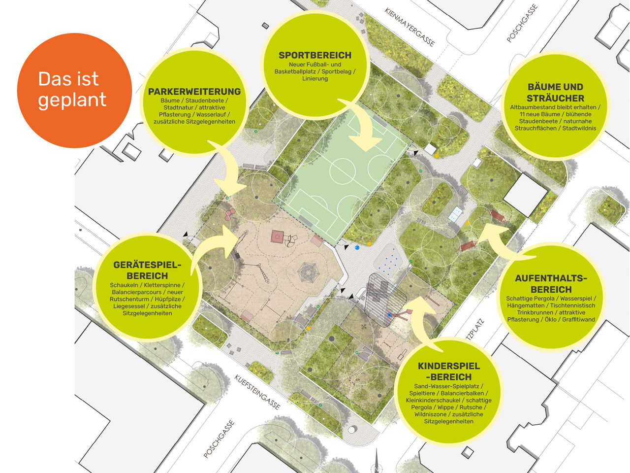 Mehr als 400 Kinder, Jugendliche, Erwachsene und Senior*innen brachten ihre Ideen und Anmerkungen ein. Diese Ergebnisse bilden eine zentrale Basis für die Planung, die vom Planungsbüro Korbwurf im Auftrag der Wiener Stadtgärten erarbeitet wird.