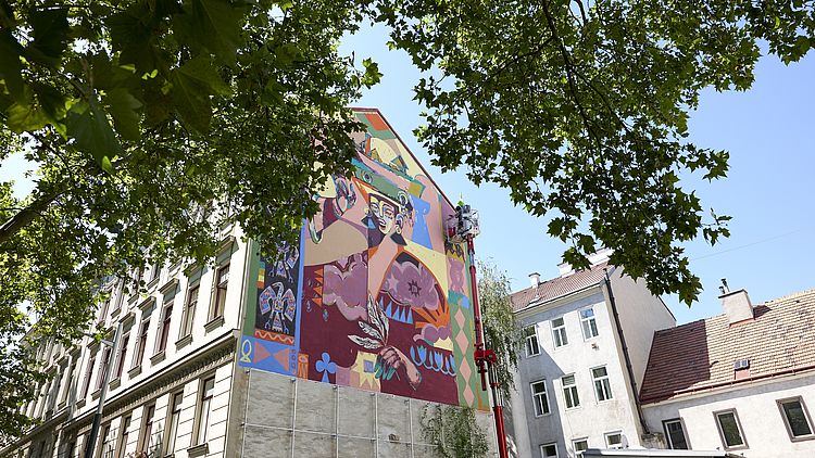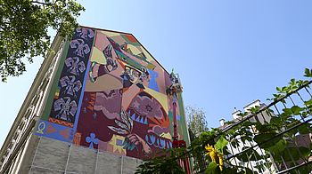 Die künstlerische Wandgestaltung in der Lambertgasse 11 wertet die Wohnumgebung auf und ergänzt die im Frühjahr von unserem GB*-Team installierte Fassadenbegrünung perfekt.