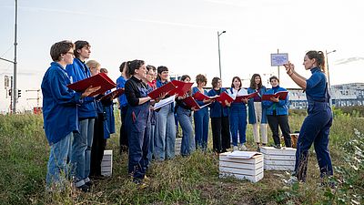 Während die Sonne hinter den Bauzäunen unterging, gab das Construction Choir Collective ein Chor-Konzert mit Liedern in vielen unterschiedlichen Sprachen!