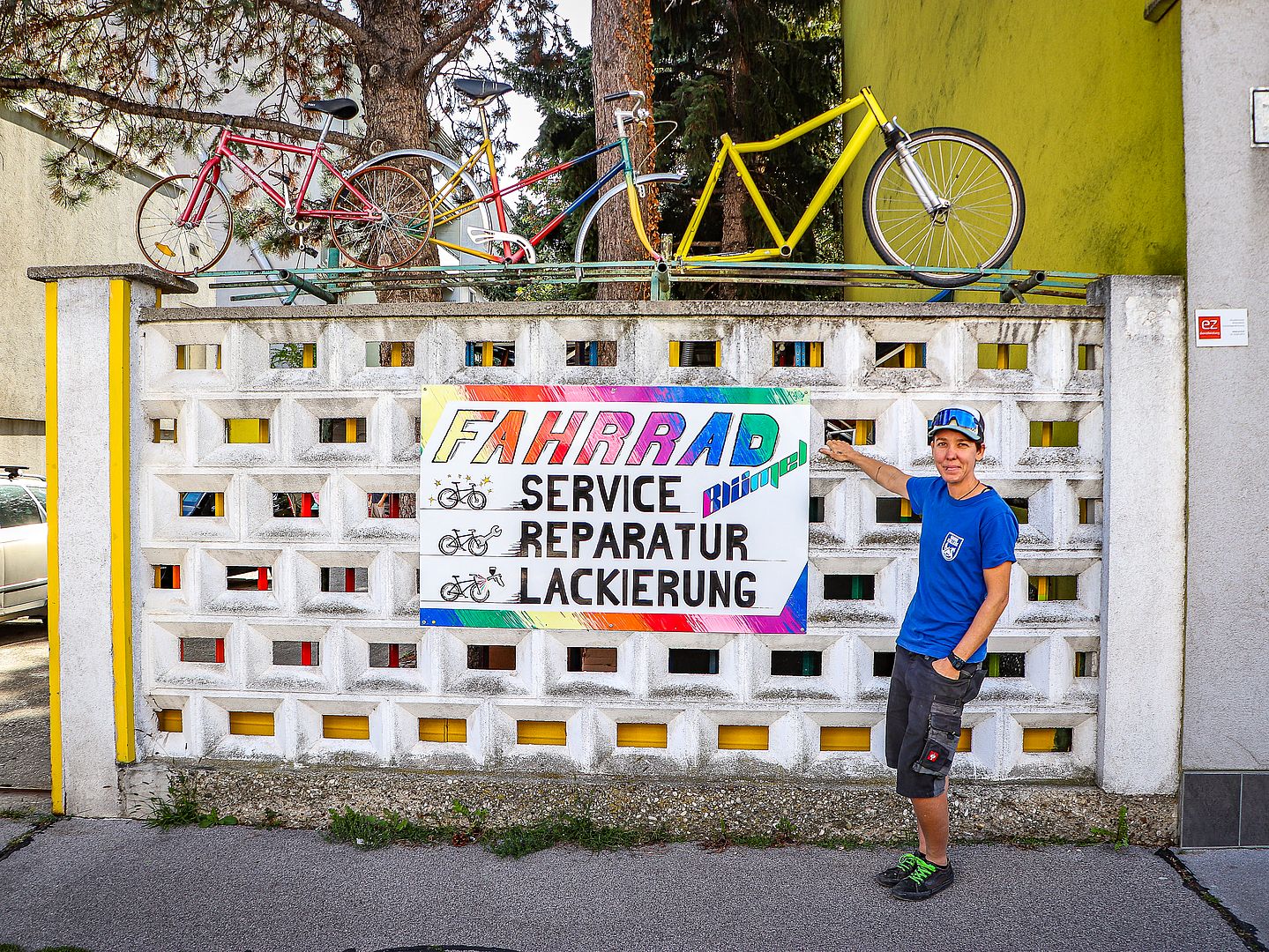 Das Besondere an „Fahrrad Blümel“ ist, dass es seinen Platz in den Hallen des KFZ-basierten Familienunternehmens „Auto Blümel“ in der Prießnitzgasse hat. Dort werden Fahrräder in einer CO2-neutralen PPA-Lackieranlage individuell verschönert – in jener Halle, in der sonst Autos und Harleys Platz finden.
