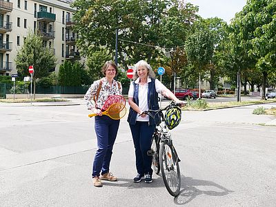 Nachbarschatz gehoben! Margot Zibar und Gabriela Mair, die Organisator*innen des Fit&Fun Alszeilenfestes, freuen sich übers Grätzelbudget für ihre Grätzelidee. (© GB*)