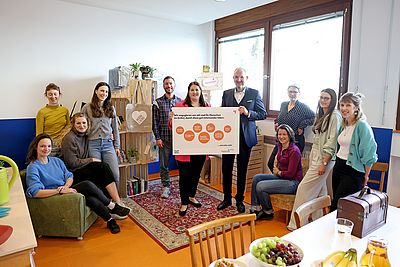 Das neue GB* Lokal in der Bernoullistraße 1 in der Donaustadt ist für alle Anrainerinnen und Anrainer im Grätzl offen! V.l.n.r.: Magdalena Hubauer (GB*), Marlene Fuchs (GB*), Linda Widmaier (GB*), Anna-Lena Belz (GB*), René Ziegler (GB*), Vizebürgermeisterin und Wohnbaustadträtin Kathrin Gaál, der Leiter der Abteilung Technische Stadterneuerung Otto Eckl, Angela Salchegger (Projektleiterin am Standort Bernoullistraße), Eva-Maria Unger (GB*), Petra Engelmann (Leiterin der Gruppe Gebietsbetreuung Stadterneuerung der Technischen Stadterneuerung) und Claudia Kurz (GB*). (© Stadt Wien/Martin Votava)