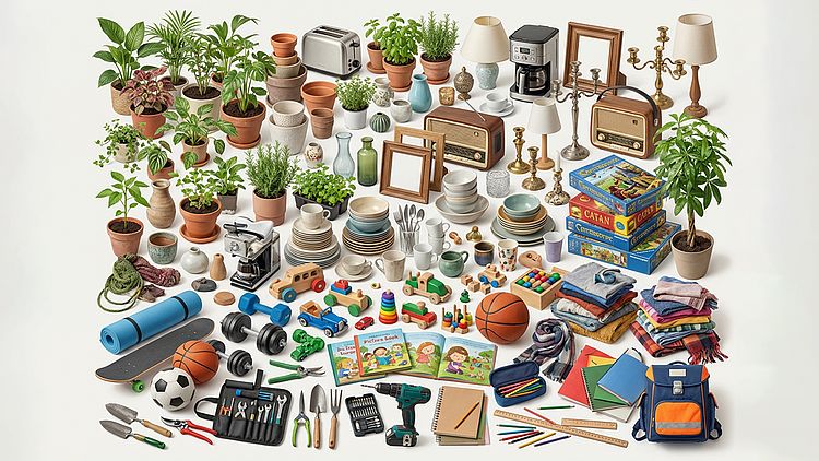 - Sportgeräte: Yogamatten, Hanteln, Skateboards, Bälle