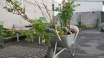 Und wir haben Glück! Dem Eigentümer WISEG, dem die Liegenschaft auf der linken Gartenseite gehört, gefällt die Idee und er beauftragt kurzerhand eine Stahlbaufirma mit der Errichtung eines soliden, 6 Meter hohen Rankgitters. Das Gitter erleichtert den Kletterpflanzen das Hochranken, und verhindert gleichzeitig, dass die Pflanzen die Mauer beschädigen.