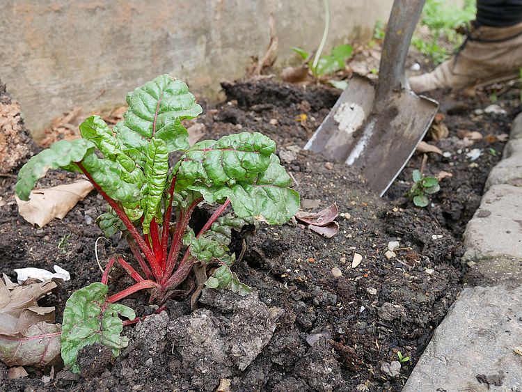 Die geltenden Corona-Lockdown-Maßnahmen durchkreuzen unseren Plan, die Fassadenbegrünung als offenen Workshop zu organisieren. Stattdessen machen wir uns an einem sonnigen Vormittag Ende April zu dritt ans Werk. Wir entfernen Unkraut und Steine aus dem Beet, lockern die Erde auf, mischen frischen Humus darunter und heben Löcher in regelmäßigen Abständen aus.