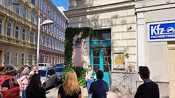 Im September 2024 spazierten wir gemeinsam mit Bewohner*innen durch den 2. und 20. Bezirk und erkundeten die Grünoasen in Wohnhäusern. Expertinnen von GRÜNSTATTGRAU informierten dabei über die positiven Auswirkungen von Begrünungen, verschiedenen Pflanzenarten und beantworteten Fragen rund um die Begrünung im eigenen Wohnhaus.