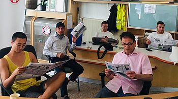 Bei der Zeitungsproduktion wurde das GB*-Team redaktionell von BewohnerInnen des Haus Liebhartstal (UMF und Familien), Julia Koch von Lieblingsleben, der Leitung des Pensionisten-Wohnhauses Haus Liebhartstal und den Stadtmenschen Wien unterstützt.
