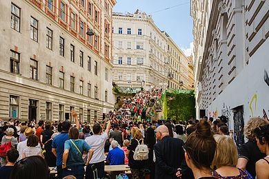 Wie schon in den vergangenen Jahren organisierte das Monami – ein Fixstern im Wiener Nachtleben – das Fest und lud gemeinsam mit weiteren Geschäftslokalen und Bewohner*innen der Gasse zum bunten Treiben.