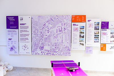 Mit Stickern, Post-its, Fotos und vielem mehr kann die Ausstellung mitgestaltet werden. Auf diese Weise erfahren die Besucher*innen, wie und was andere über den Stadtteil denken und welche Ideen es für eine gute Nachbarschaft gibt. Ein Mini-Pingpong-Tisch bietet Gelegenheit, andere Bewohner*innen im Stadtteil spielend kennenzulernen.