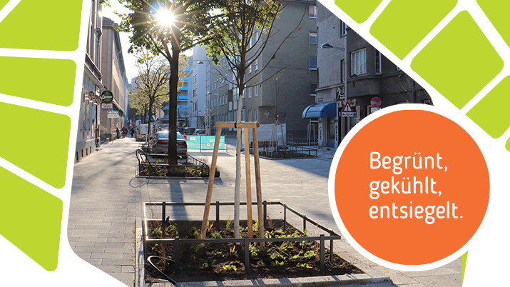 - 3.000 Quadratmeter wurden entsiegelt. Durch eine Niveauannäherung trennt ein nur 3 Zentimeter hoher Randstein die Fahrbahn von den Gehwegen beziehungsweise Parkstreifen.