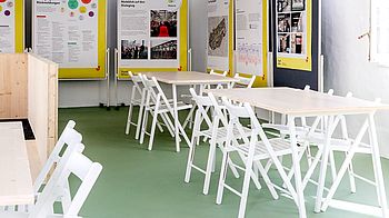 Seit Mai 2023 kann der Raum von der Nachbarschaft kostenfrei genutzt werden – z.B. für Workshops, Sitzungen, Diskussionsrunden, kleinere Ausstellungen und andere Formate.