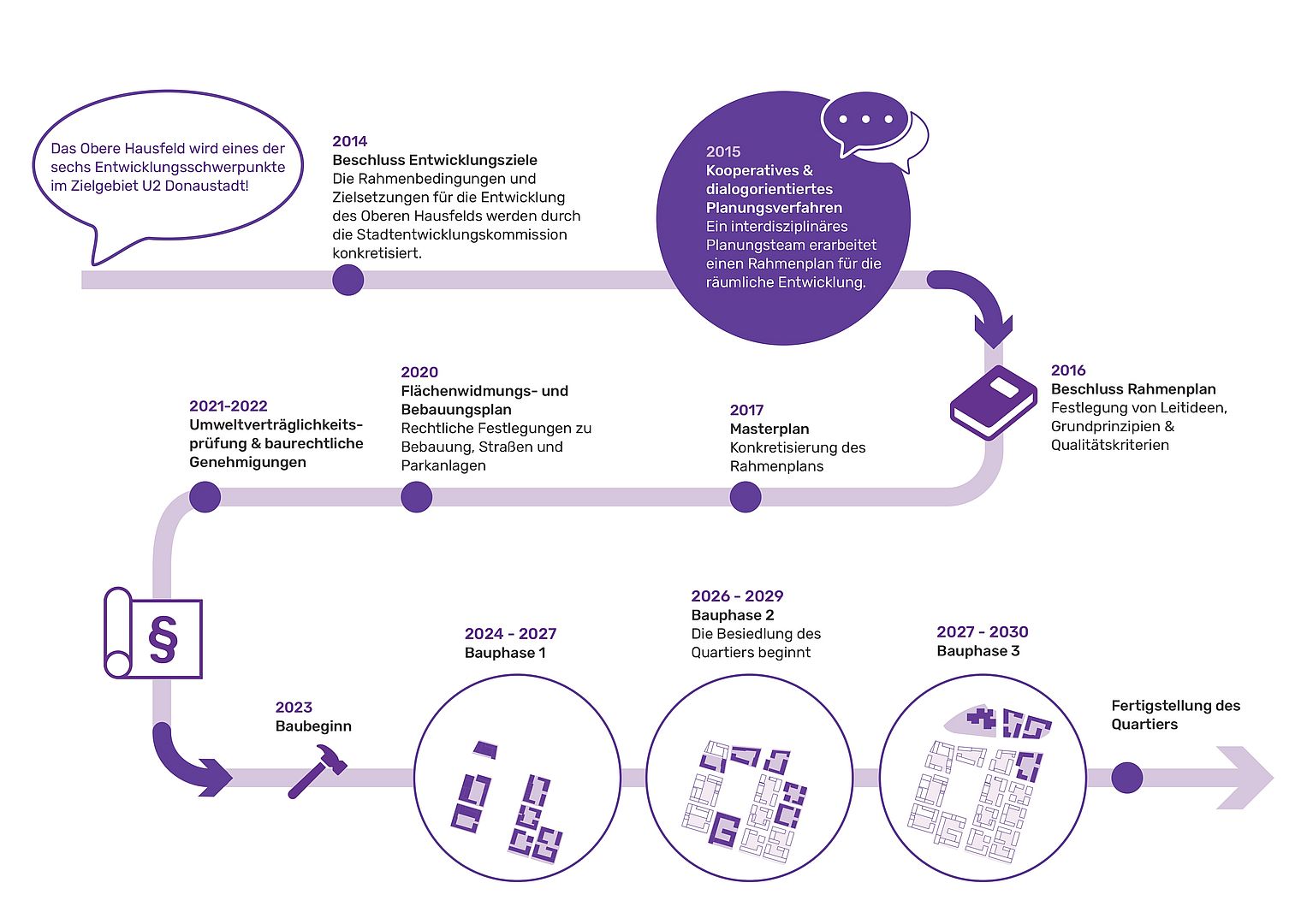Dynamisch, bunt und vernetzt – so stellt sich der neue Donaustädter Stadtteil Oberes Hausfeld vor. Das Stadtentwicklungsgebiet liegt in Aspern und wird von zwei Stationen der U-Bahn Linie U2 erschlossen. Hier entstehen auf einer 26 Hektar großen Fläche 3.700 Wohneinheiten mit den Schwerpunkten auf Mobilität, Grünraum, Wohnen und Arbeiten.