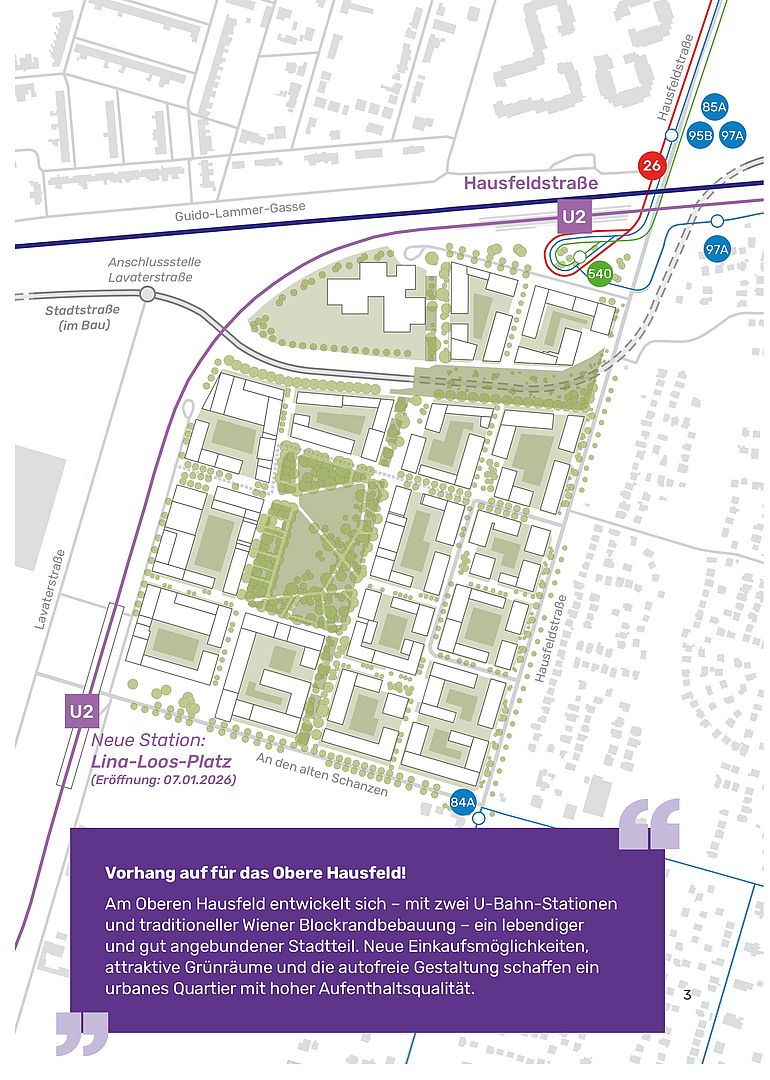 Mit dem Oberen Hausfeld entsteht ein besonders gut an den öffentlichen Verkehr angebundener Stadtteil. Die U-Bahnstation Hausfeldstraße, die neue U-Bahnstation Lina-Loos-Platz zwischen den Stationen Hausfeldstraße und Aspernstraße sowie Straßenbahn- und Buslinien schaffen die Voraussetzungen für einen lebendigen, urbanen und hochwertigen Stadtteil.