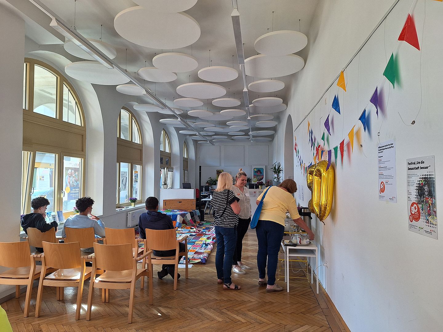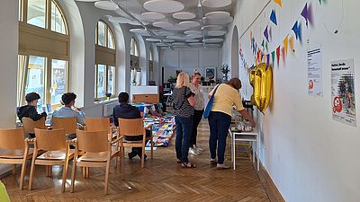 In Floridsdorf sind viele Stadtteilpartner*innen aktiv. Sie alle bieten Raum für die Nachbarschaft - in unterschiedlicher Größe, zu unterschiedlichen Nutzungsbedingungen. Vom Festsaal im Amtshaus bis zu Räumlichkeiten in der Bücherei, im Küchenstudio oder in der Kantine 1210. Auch wir sind Stadteilpartner und haben Raum im GB*Stadtteilbüro am Schlingermarkt.