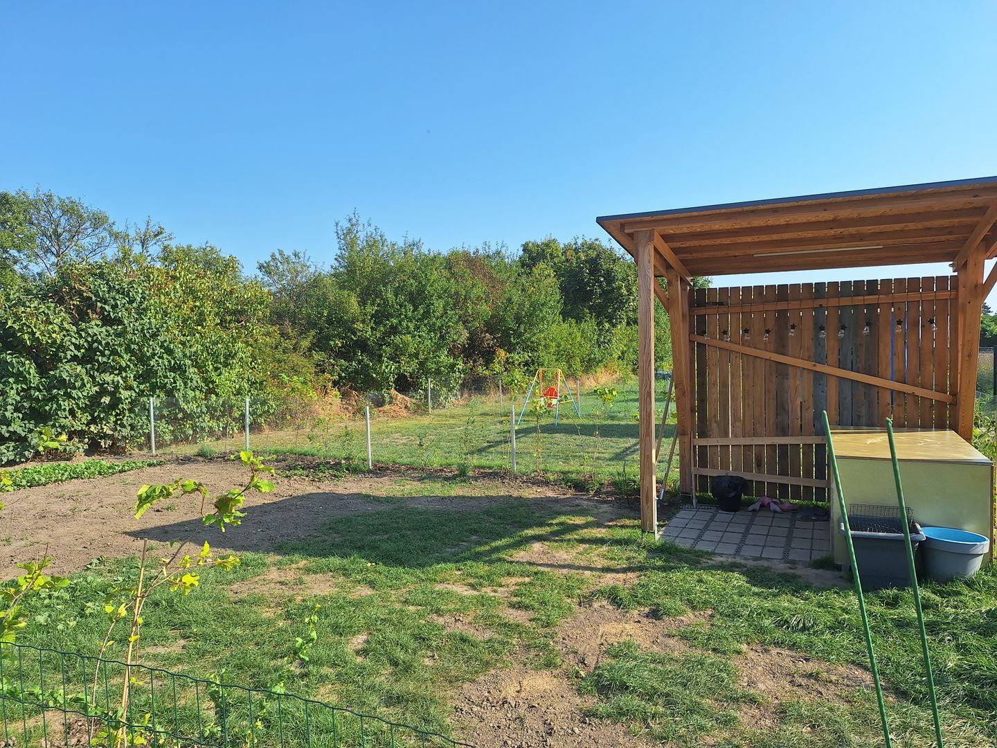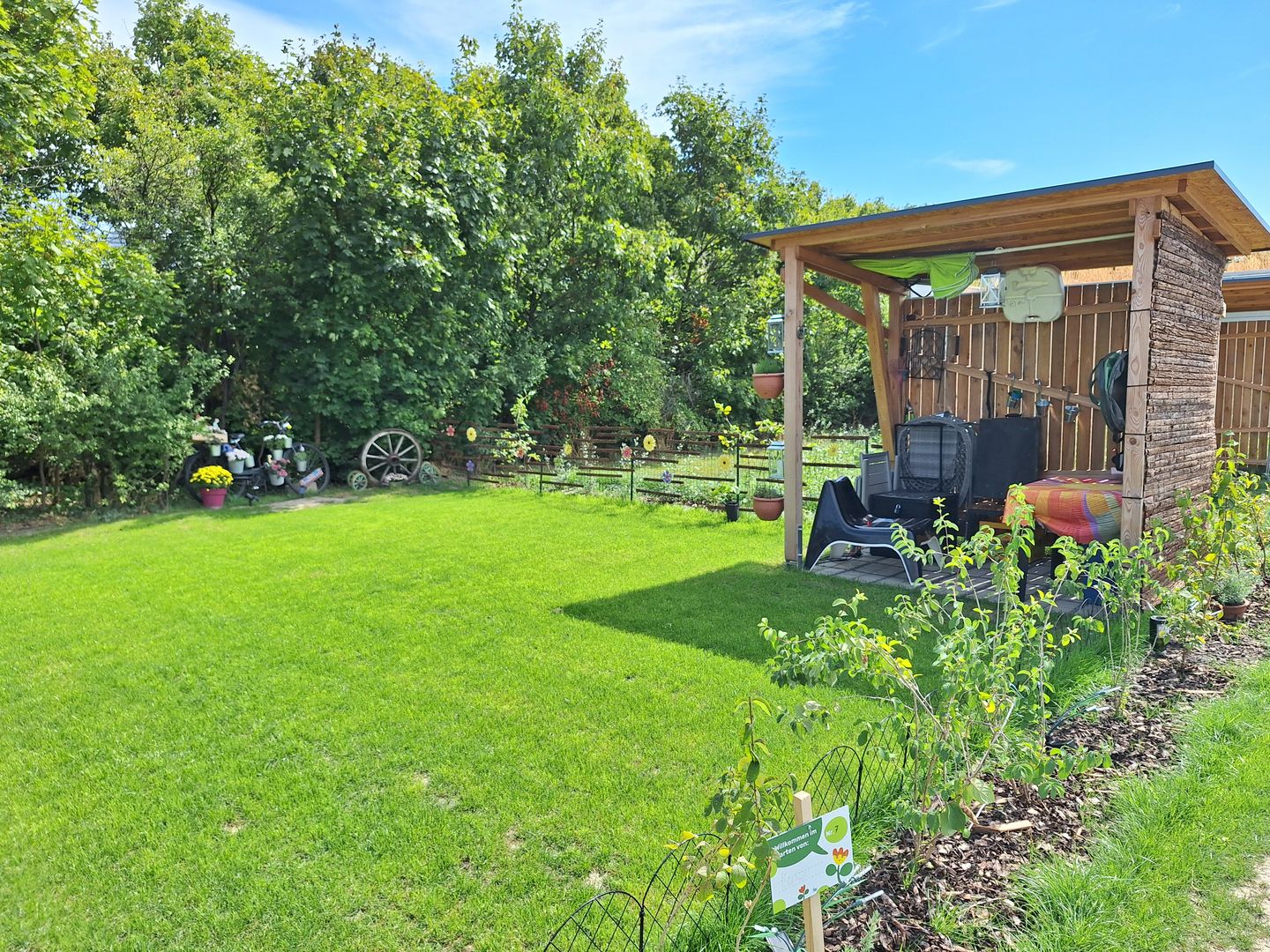 - Rund 6 m² großer überdachter Bereich (Pergola), zum Unterstellen vondem Gartenmöbel oder Gerätschaften