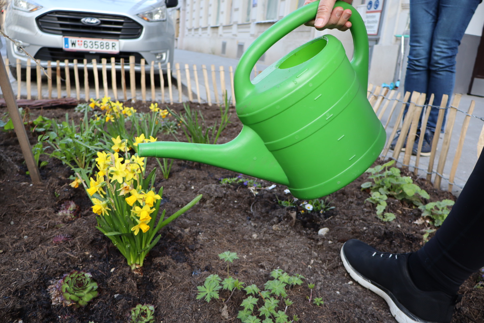 Die Baumscheibe war einst Teil eines Gartens in der nahegelegenen Steinbruchstraße – geblieben ist dieses kleine Stück Grün, das nun mitten im Trubel der Stadt aufblüht. Viele bleiben stehen, wenn Claudia und Renate garteln, lächeln, sagen: „Schön schaut das aus!“ – und gehen erfreut weiter.